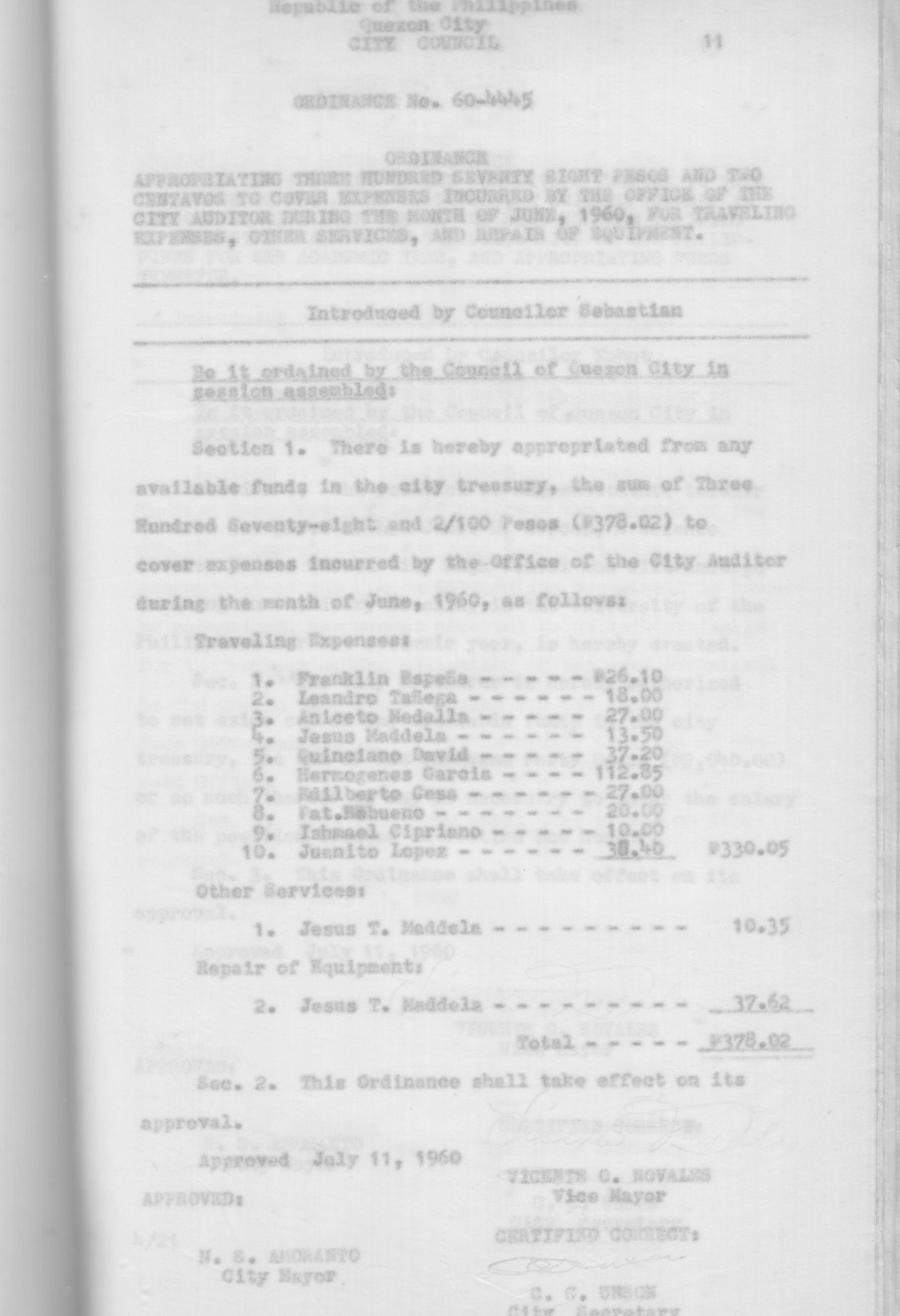 Ordinance appropriating Three Hundred Seventy Eight Pesos and Two Centavos to cover expenses incurred by the Office of the City Auditor during the month of June, 1960, for traveling expenses, other services, and repair of equipment.